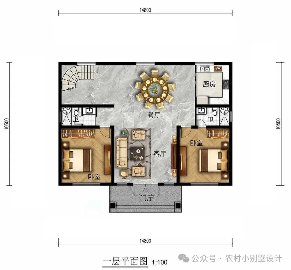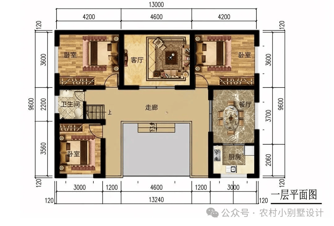一层:2个卧室,一公卫,一私卫,入户堂屋,一厨房,一餐厅,一车库,一棋牌室