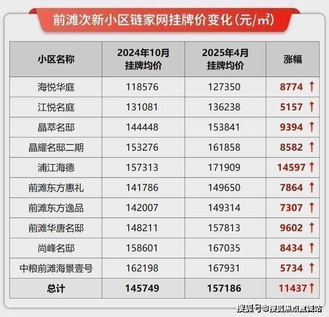 我统计了去年10月和今年4月前滩次新小区的挂牌均价,清一色的往上调价,晶萃名邸上涨9千+/㎡,浦江海德更是上涨近1.5万/㎡.平均上涨幅度超过1.1万/㎡!