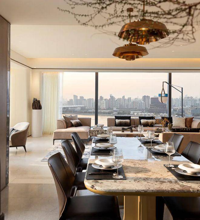 客餐厅与阳台等宽贯通,最大化延伸观景视野,会客宴请时,窗外盛景便是天然的格调装饰;