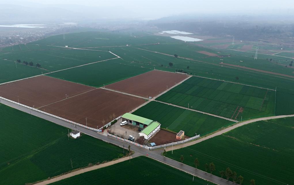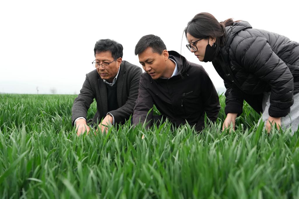 4月8日,西北农林科技大学陇县小麦科技小院负责人张超(中)在试验示范田里查看小麦生长情况。新华社记者 李一博 摄