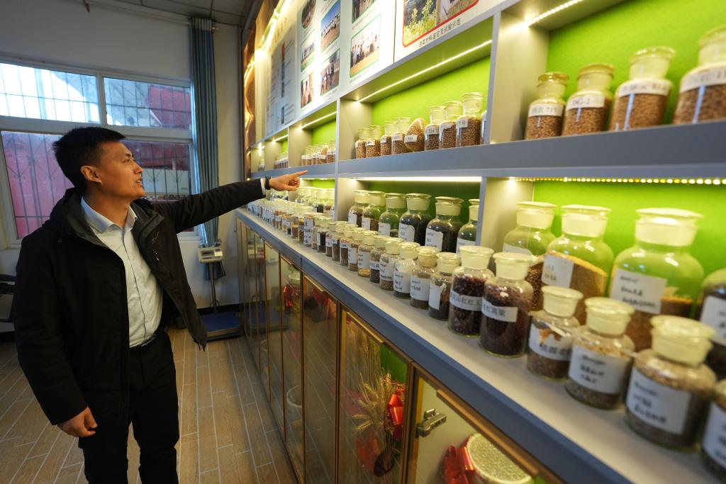 4月8日,西北农林科技大学陇县小麦科技小院负责人张超在介绍小麦品种。新华社记者 李一博 摄