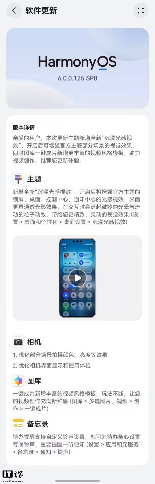 1 月 5 日消息,华为 Mate 80 系列、Mate X7 系列手机已于去年 12 月推送了鸿蒙HarmonyOS6.0.0.125 版本升级,主题新增沉浸光感视效,带来全新视觉体验,同时图库一键成片新增更丰富的视频风格模板。