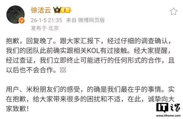 1 月 5 日消息,小米新任公关部总经理徐洁云今日发文致歉:经过仔细的调查确认,我们的团队此前确实跟相关 KOL 有过接触。经大家提醒,经过查证,我们立即终止可能进行的任何形式的合作,且以后也不会合作。