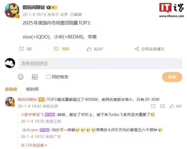 消息称 vivo、小米、苹果 2025 年度国内市场激活销量均超 4000 万,拿下 TOP3