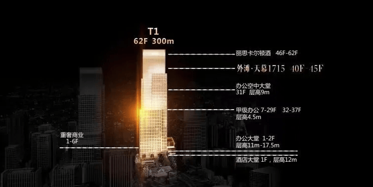 共包含46万㎡超高层地标办公楼、17万㎡(其中9万㎡地下)商业、12.6万㎡住宅、4.2万㎡超五星酒店、18万㎡的金融不夜城ParkMall